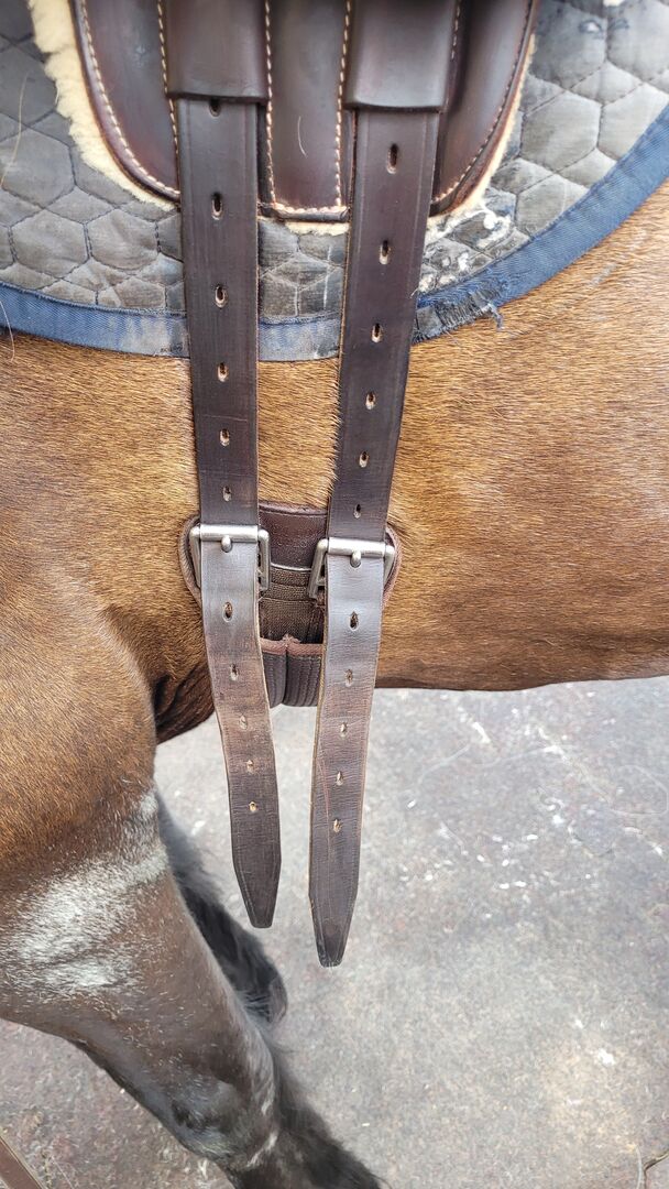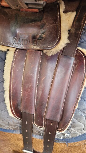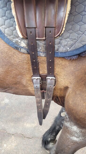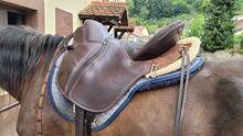 Se bilder för skick, begagnad men mycket välvårdad. Passar på en smal Welsh Cob på 156 cm. Sadeln säljs endast eftersom den äldre hästen nu är pensionerad. Den matchande blå, vadderbara Mattes-lamskinnsdynan kan också köpas mot en extra kostnad.