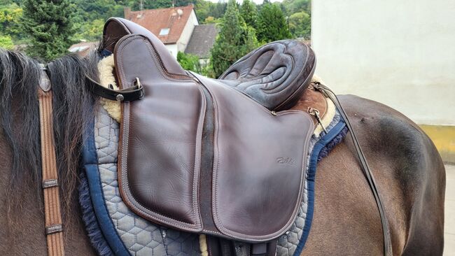 Stor sittyta och smal kammarbredd. Komfortabel och bred, djup sits i sydd mocka. Pommel klädd med slätt läder, breda sadelklaffar i läder, flera bagageringar tillgängliga. Mjuk sadelpanel klädd med äkta lammskinn för extra komfort för hästens rygg. Långa gördelremmar med lammskinnsfodrade flankskydd i läder.