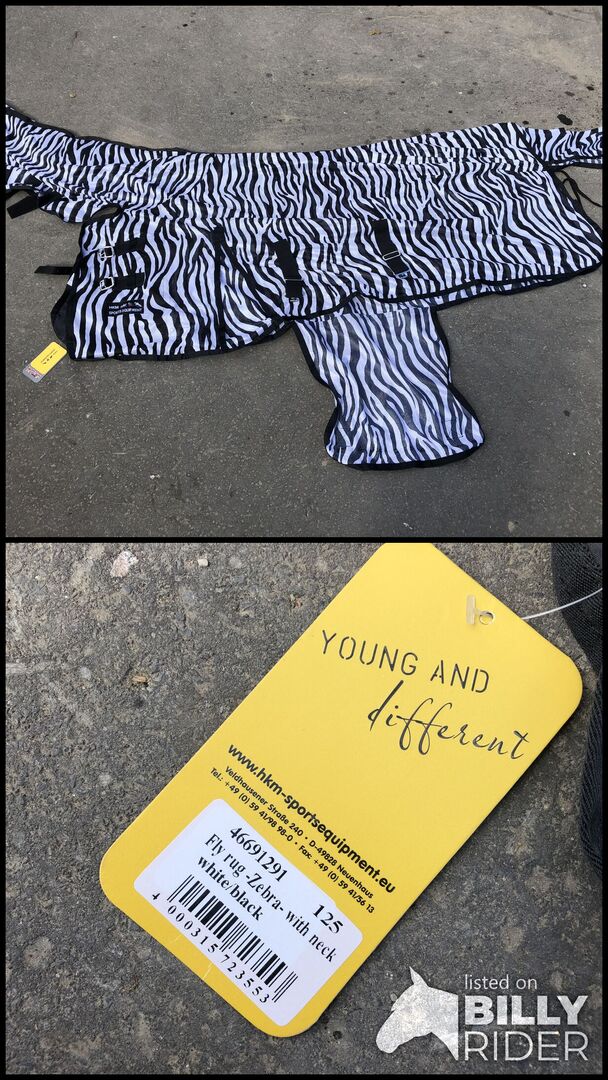 Zebra Fly Blanket - Säljer min helt nya flugmatta med halsstycke och magplatta. Storlek 125. Tyvärr sitter filten för hårt på mitt sto. Filten är helt ny och har bara burits en gång under en provning.