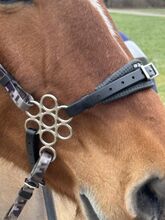 Standard användning Lämna en cirkel öppen mellan nosgrimman, tygelremmen och huvudstyckets fäste. Hakremmen fästs mellan tyglarna och huvudstycket. För det vanliga tygelfästet fäster du tyglarna i de längre cirkelringarna. Detta skapar en mycket mild hävstångseffekt genom att vrida hjulet något när man trycker på tyglarna.